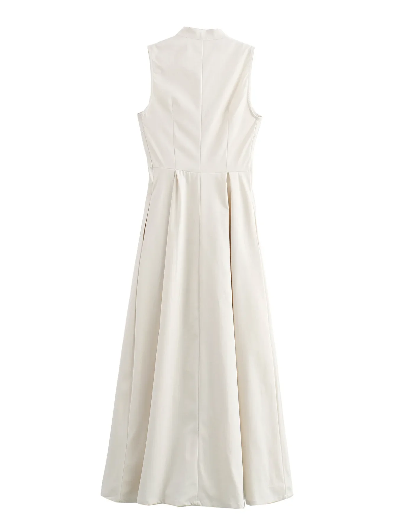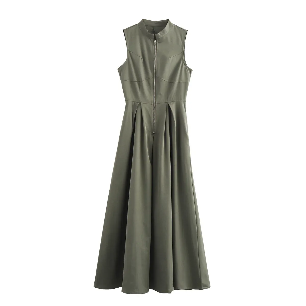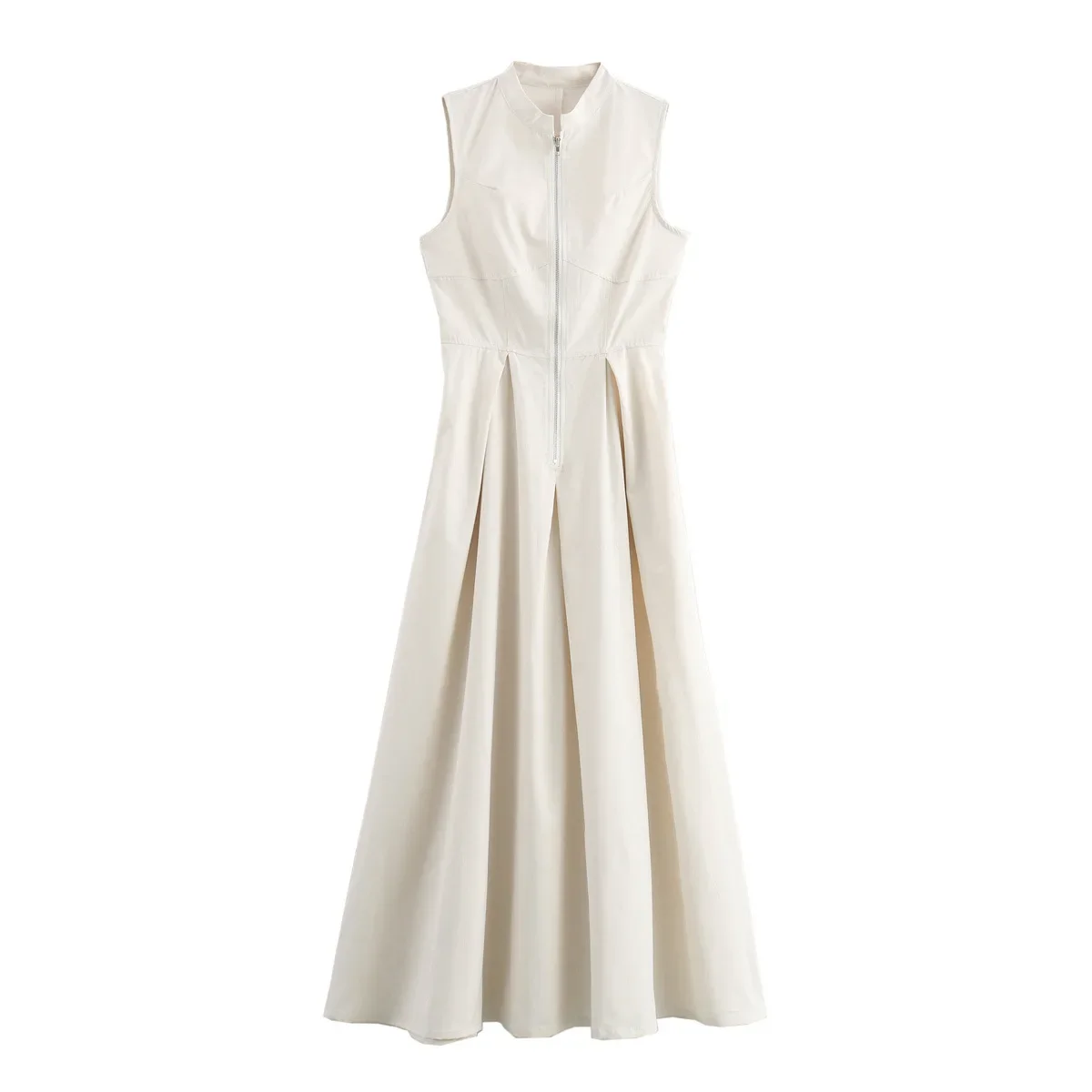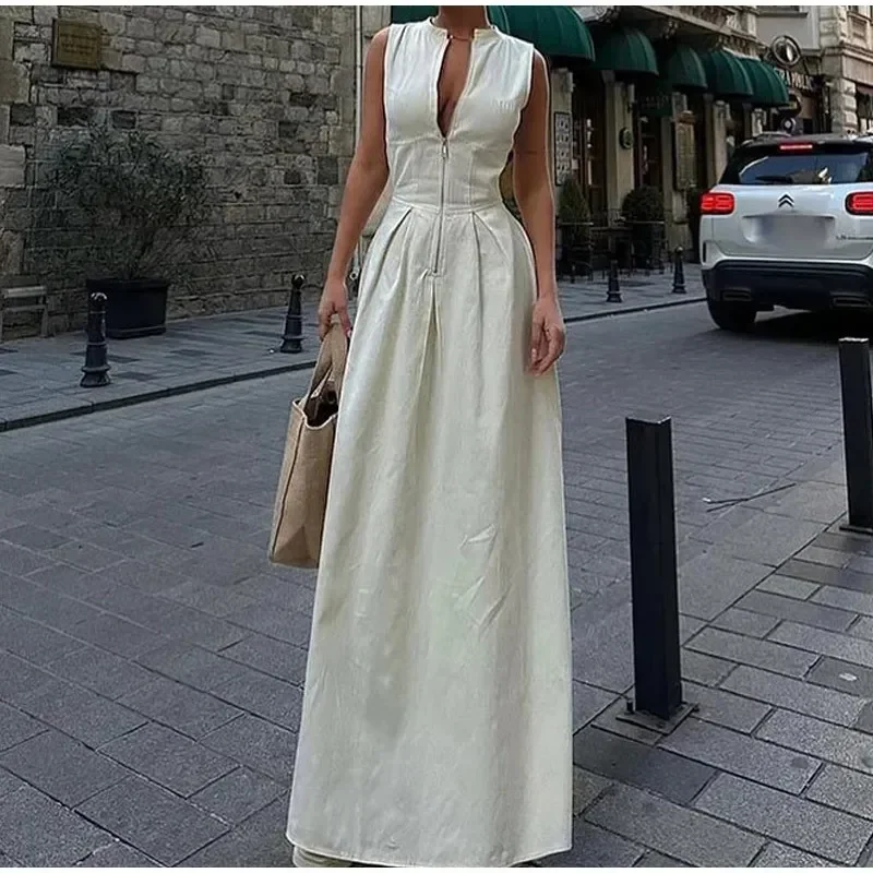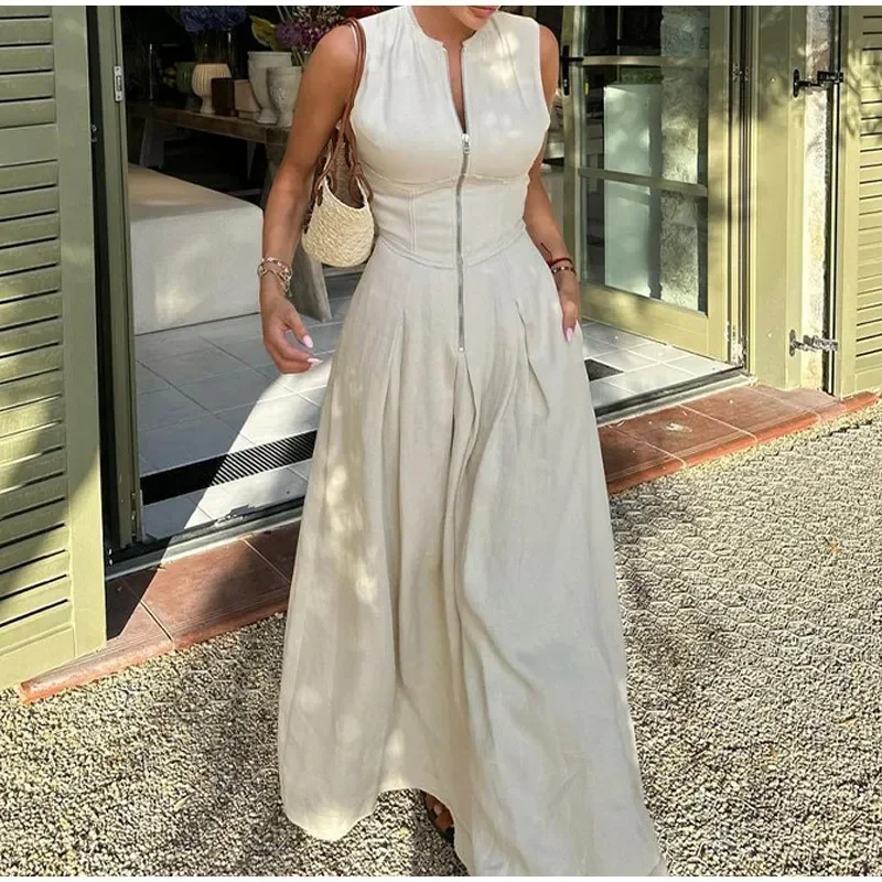 Jupe longue maxi plissée sans manches pour femme, collection été 2024, poches zippées sur le devant, coupe ajustée trapèze, ourlet large, style années 2000