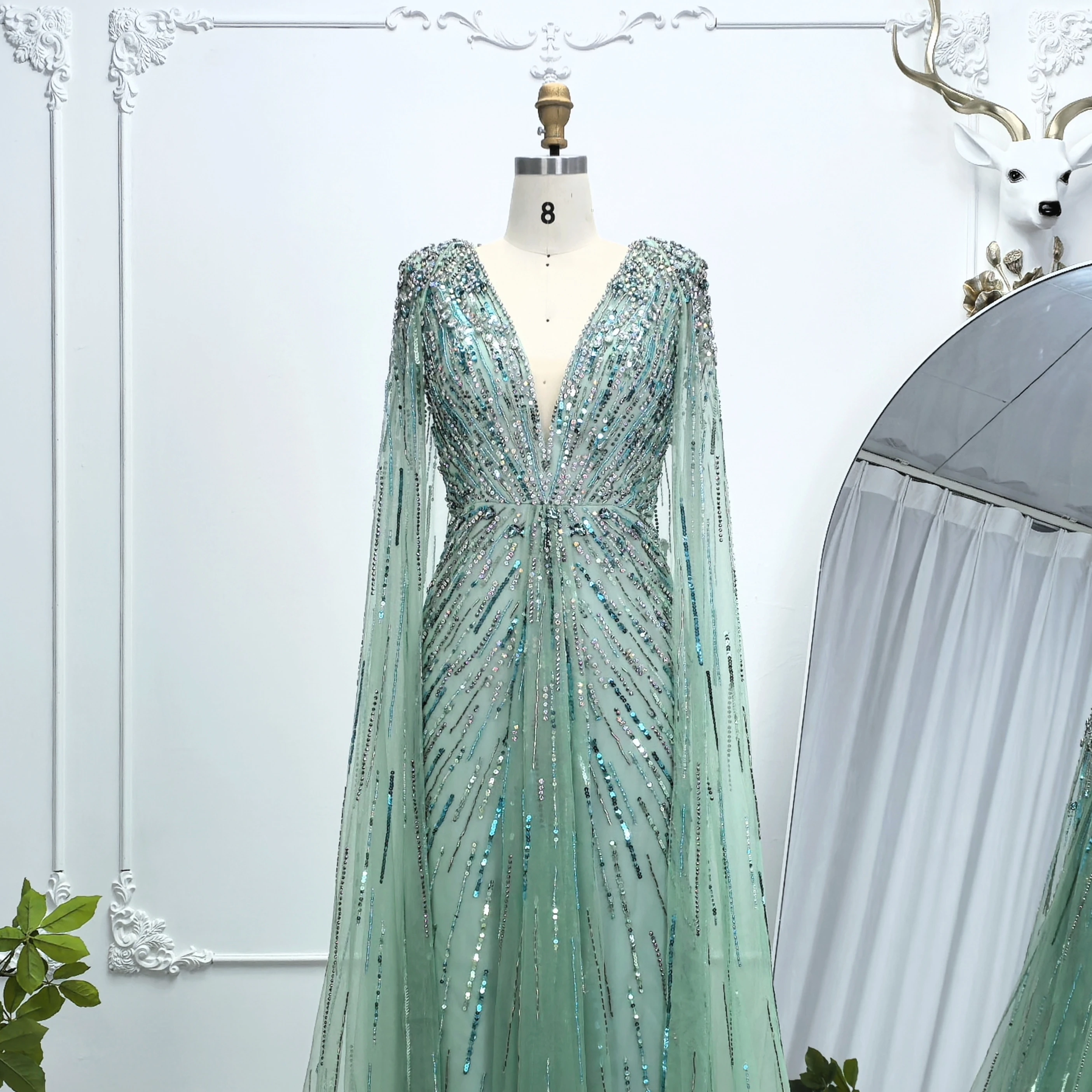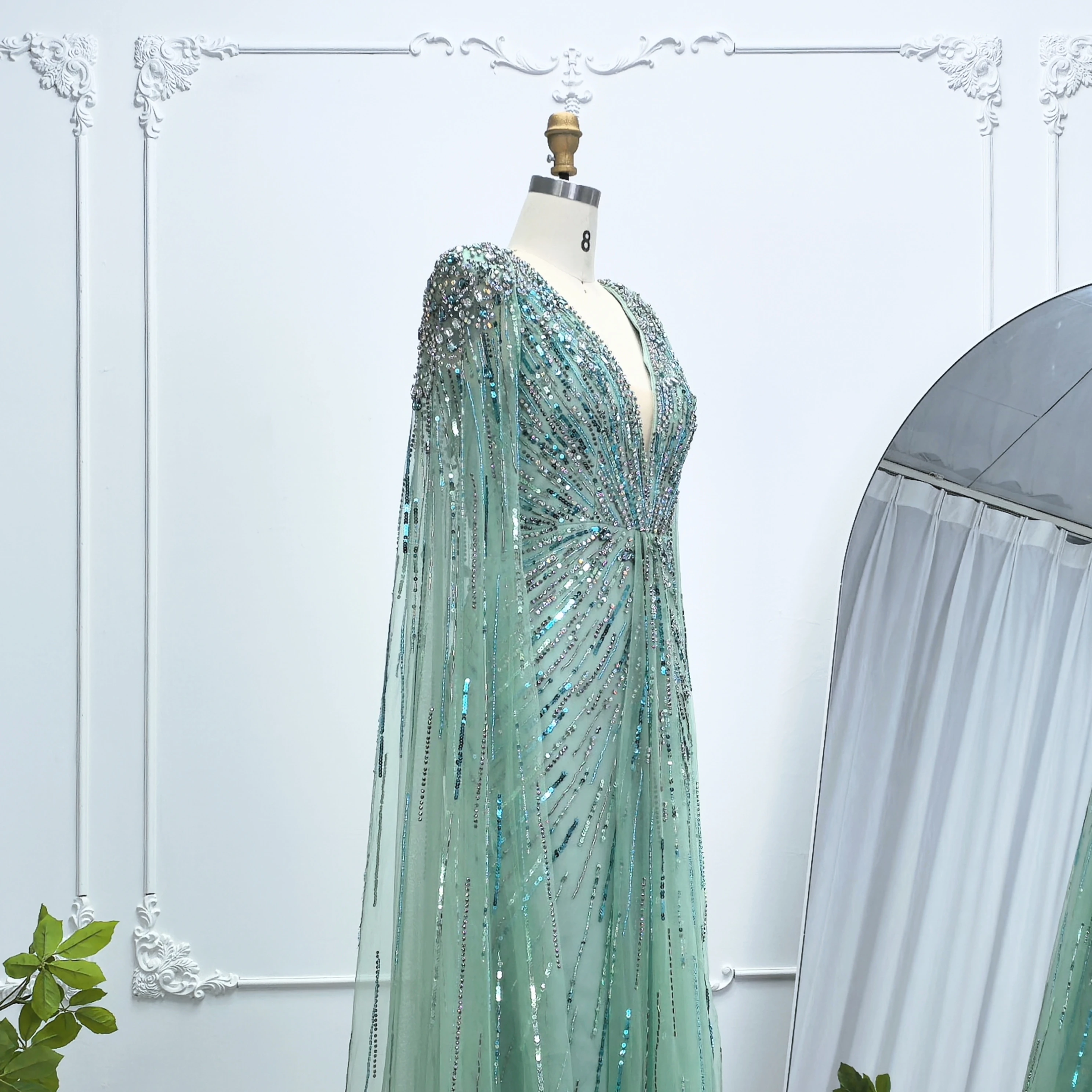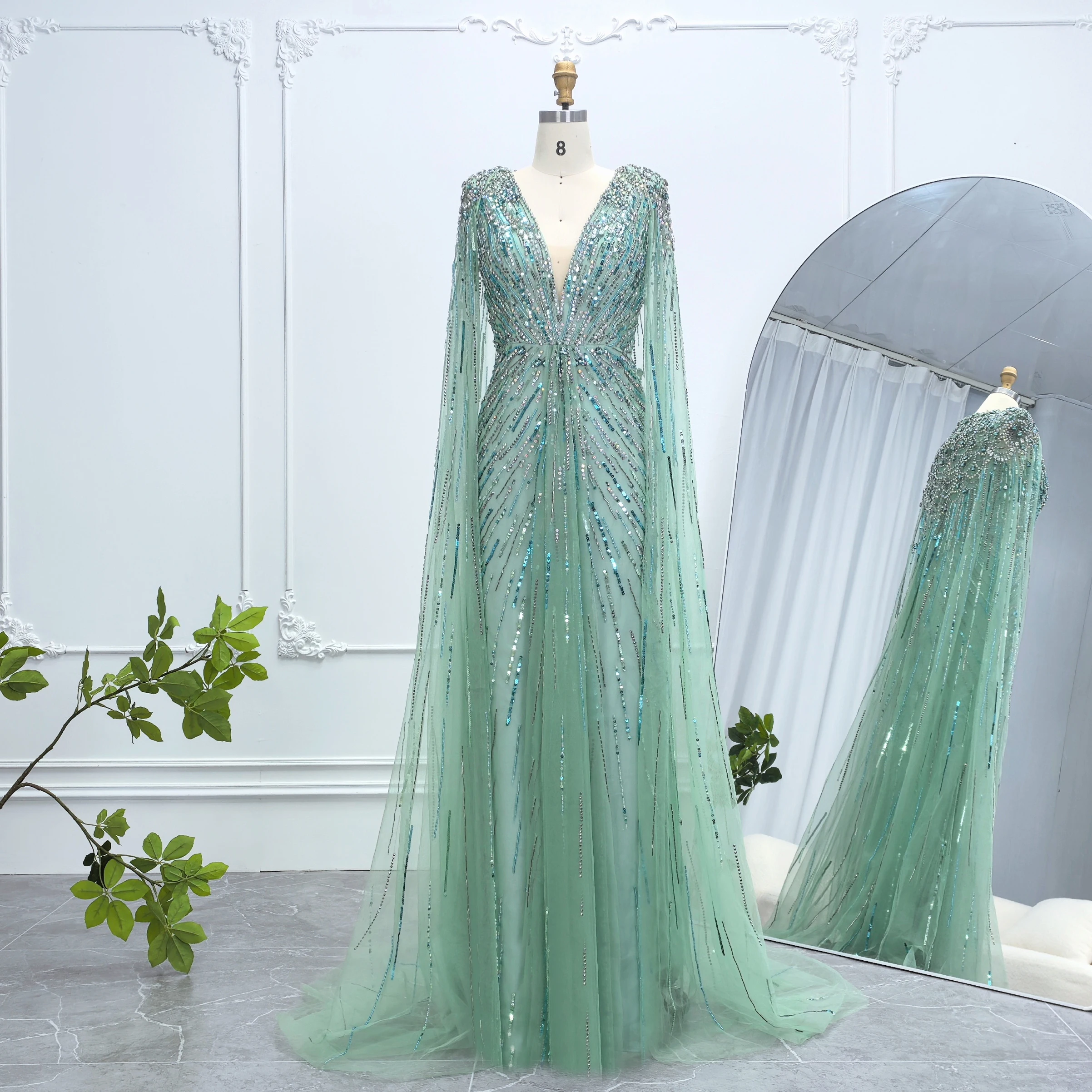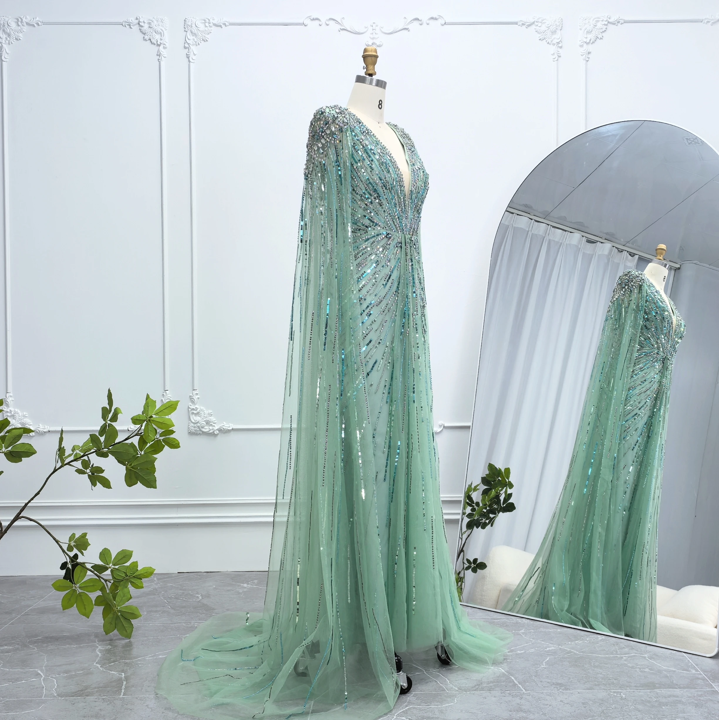 Robe de soirée luxueuse Alice CollectionPro vert sauge pour femme 2025 avec manches cape, robe de mariée longue champagne sur mesure