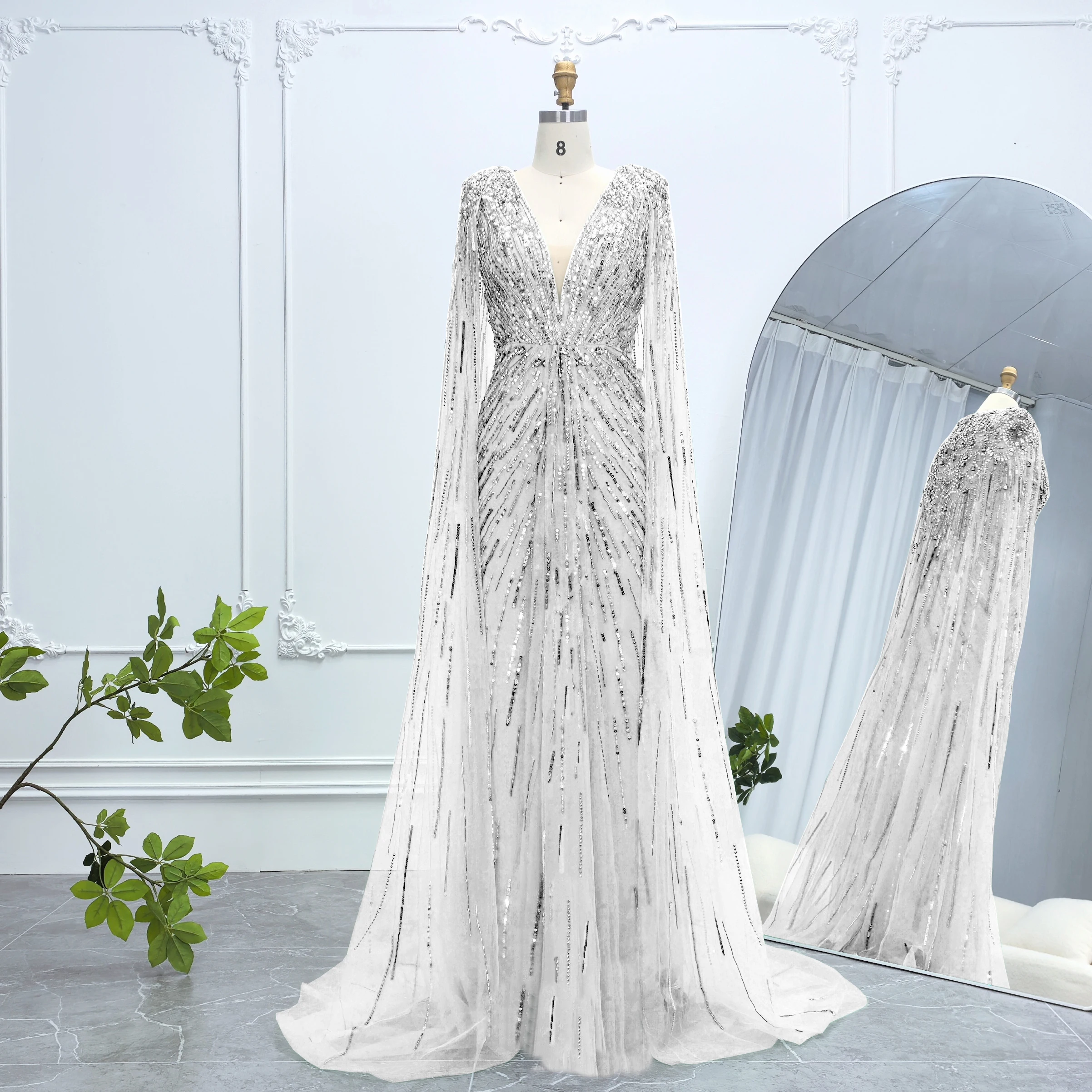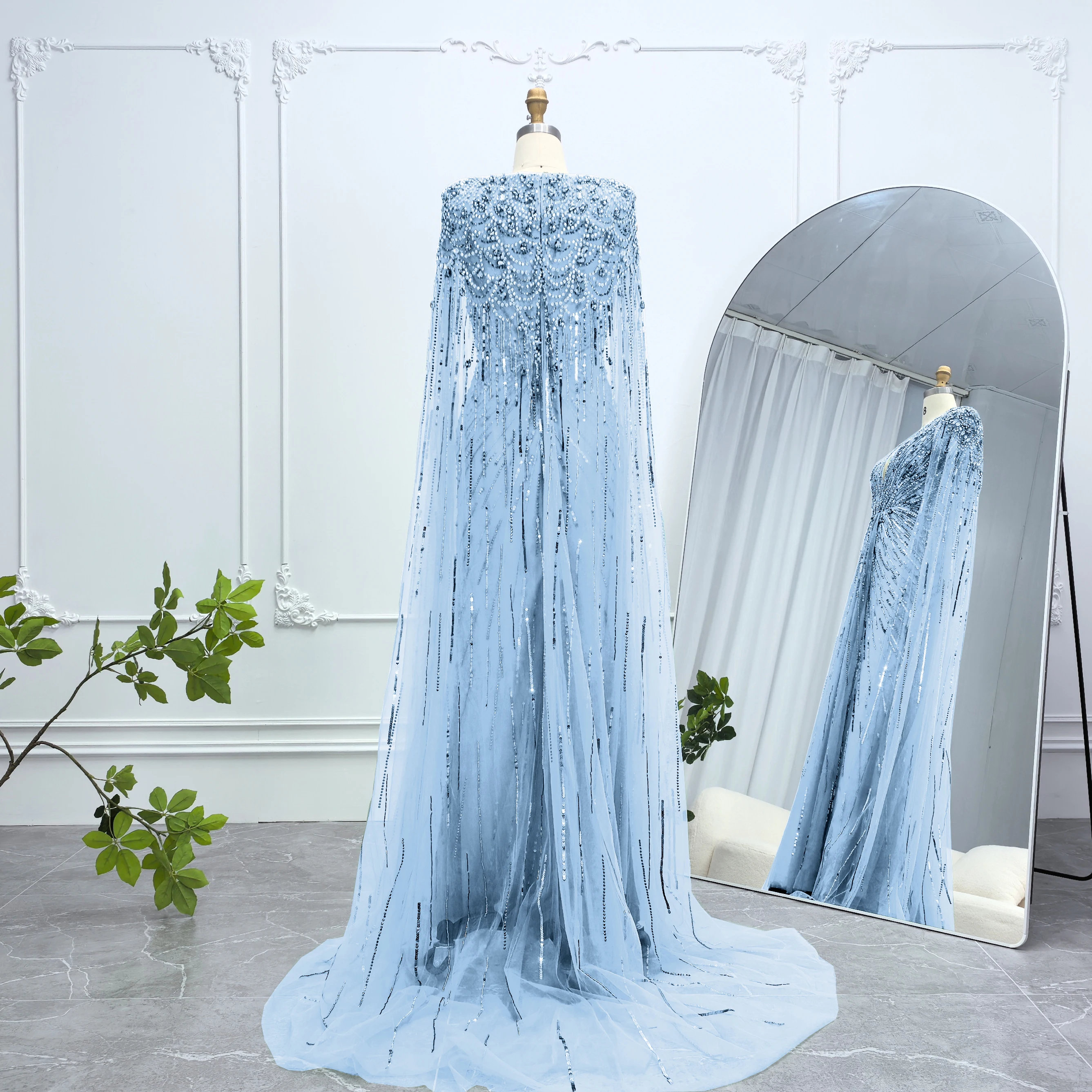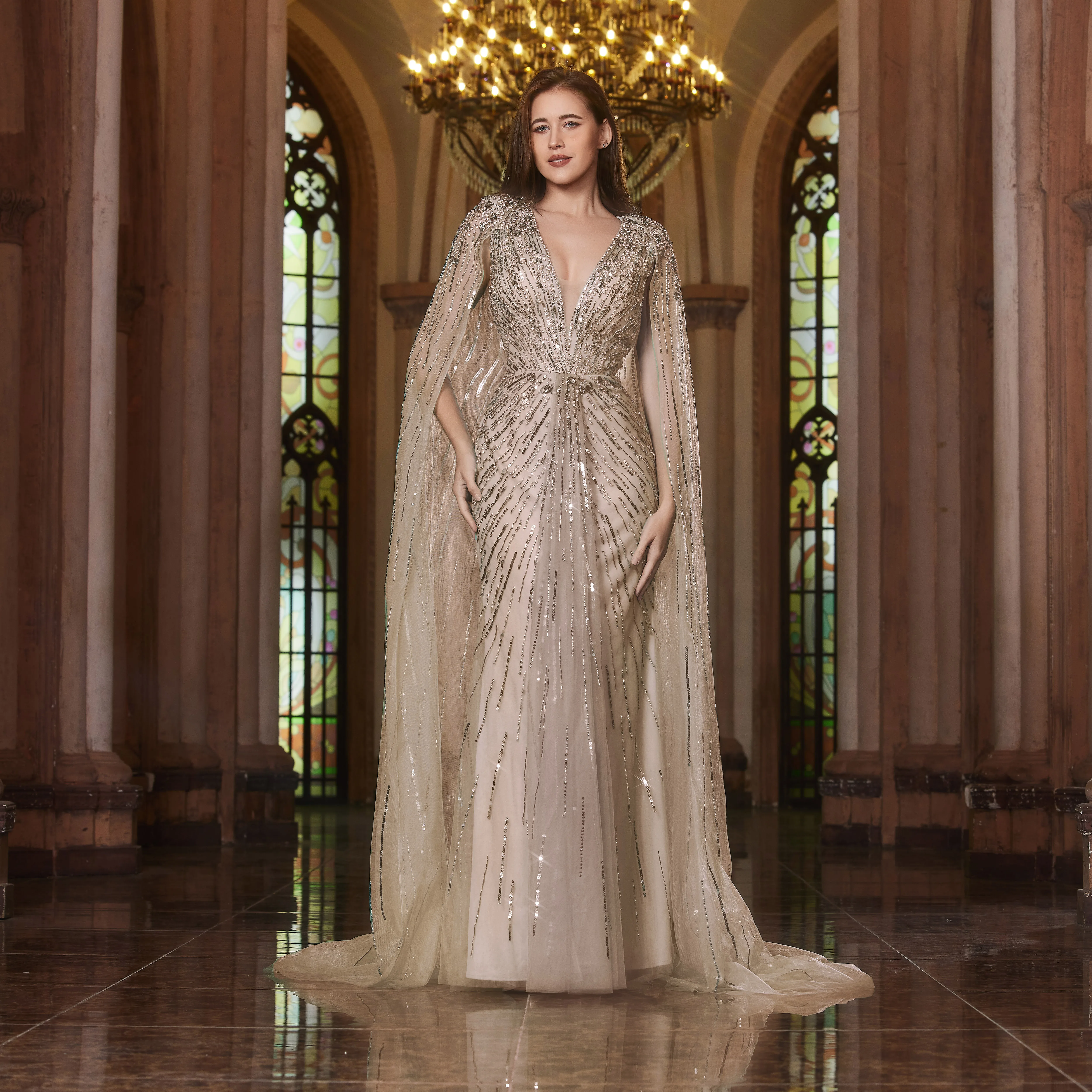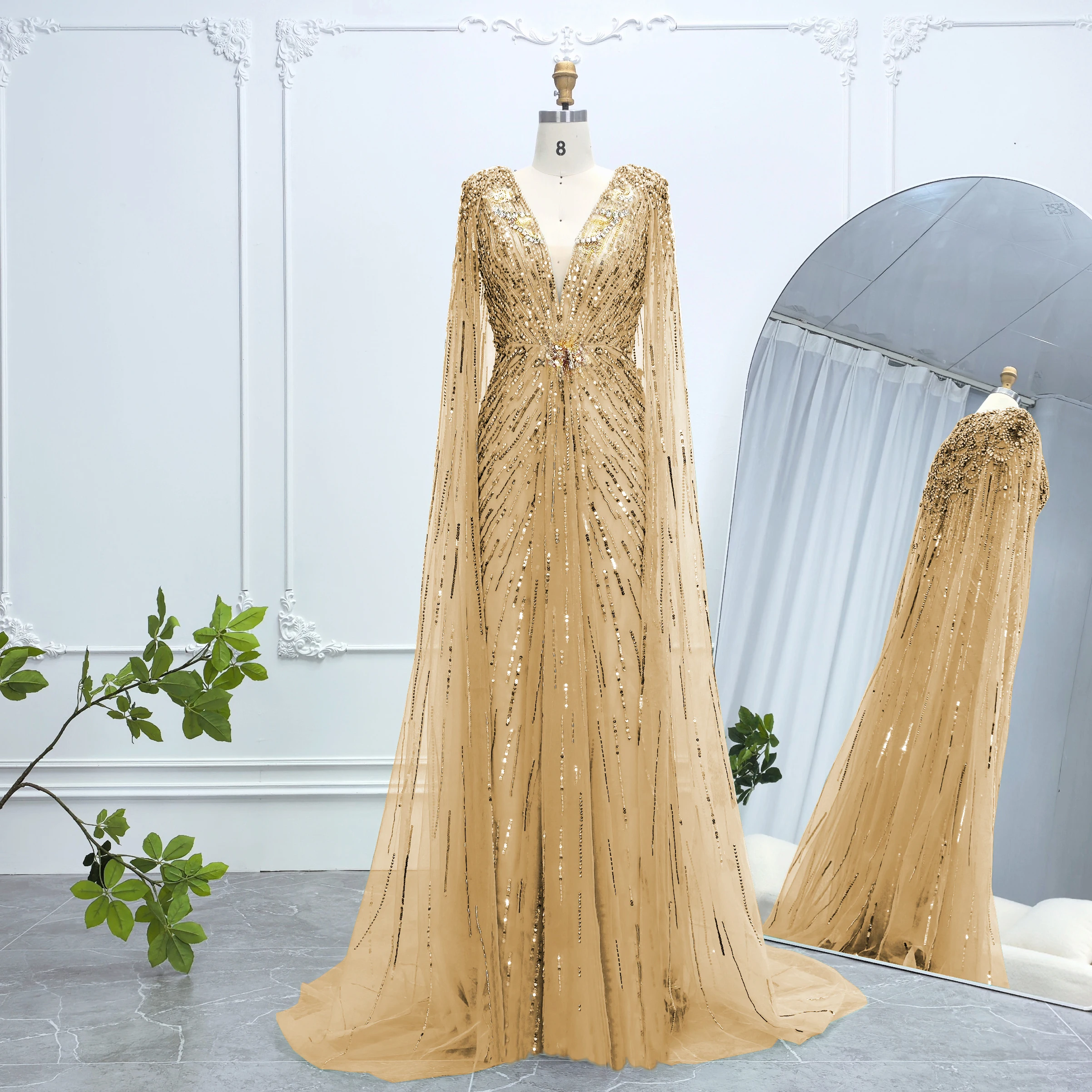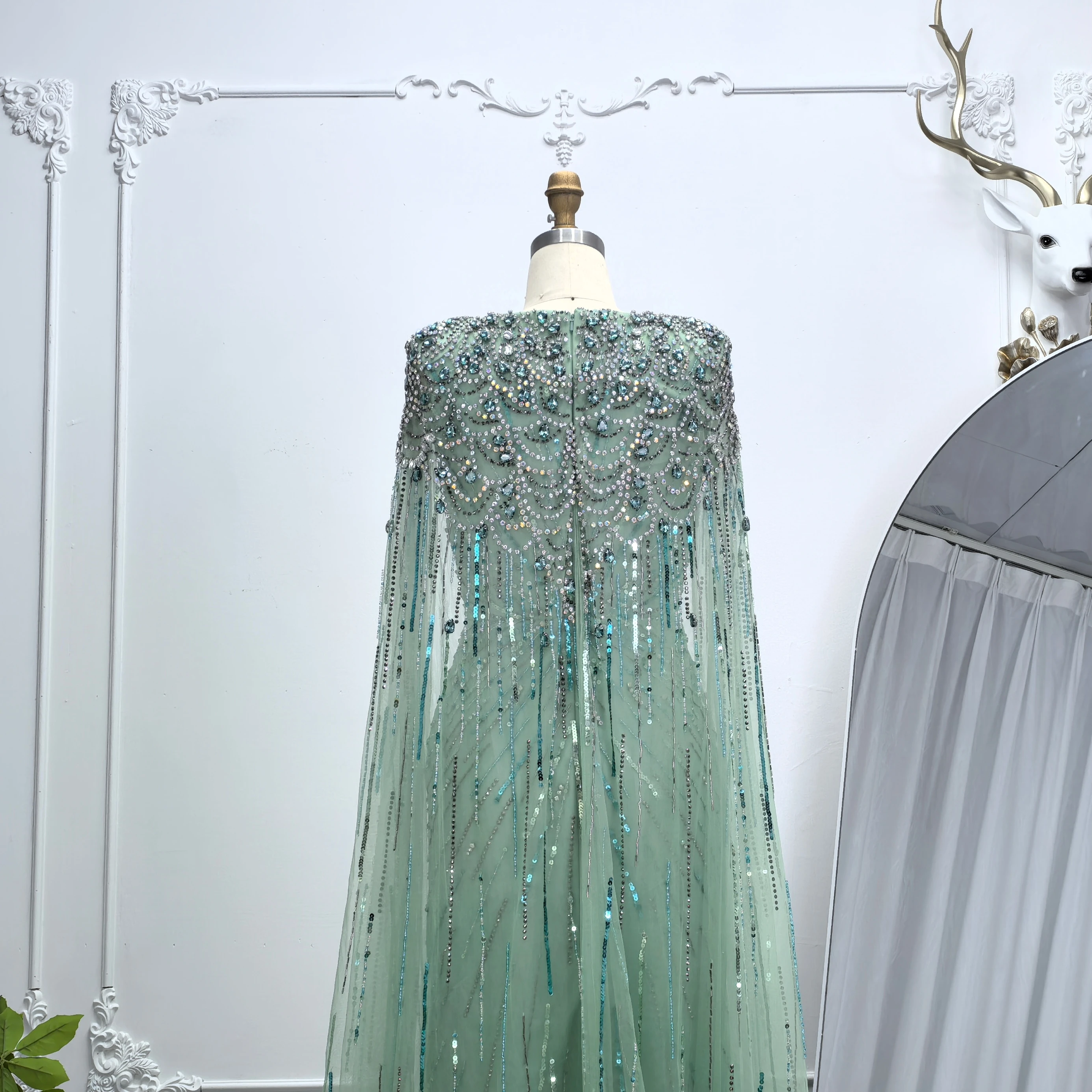 Robe de soirée luxueuse Alice CollectionPro vert sauge pour femme 2025 avec manches cape, robe de mariée longue champagne sur mesure