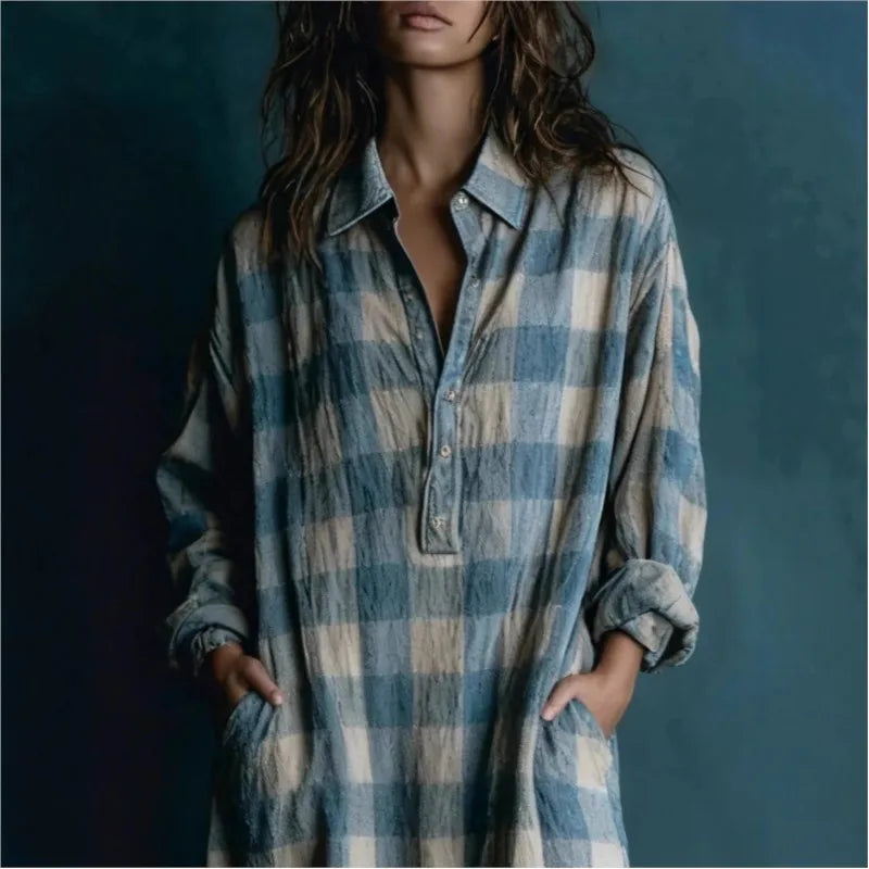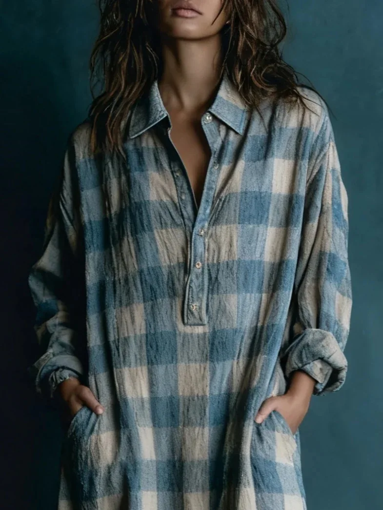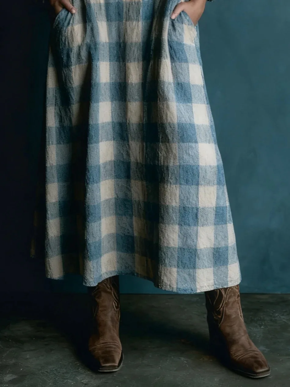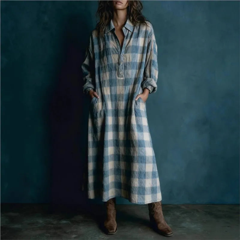 Robe longue ample à carreaux, coupe droite, poches et manches longues, idéale pour le printemps et l'automne. Jupe longue confortable et élégante pour femme.