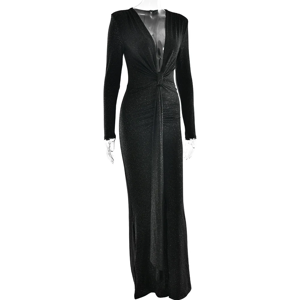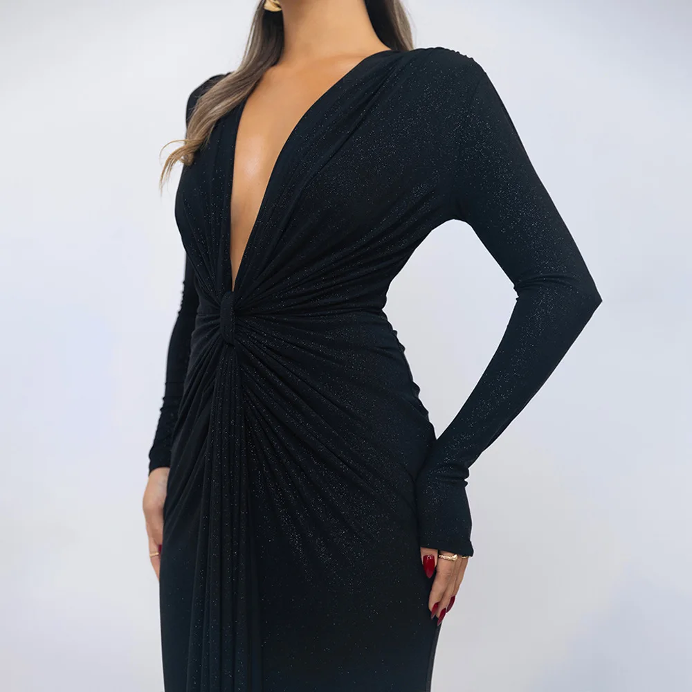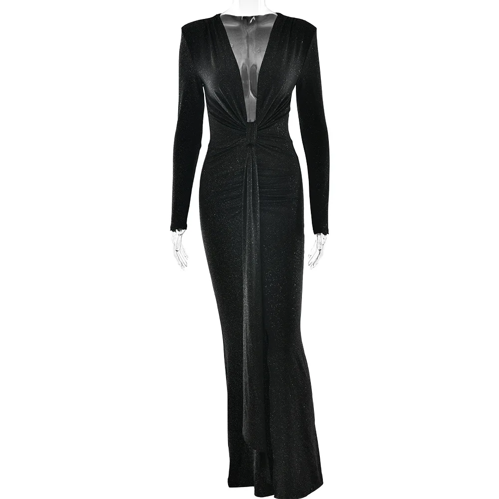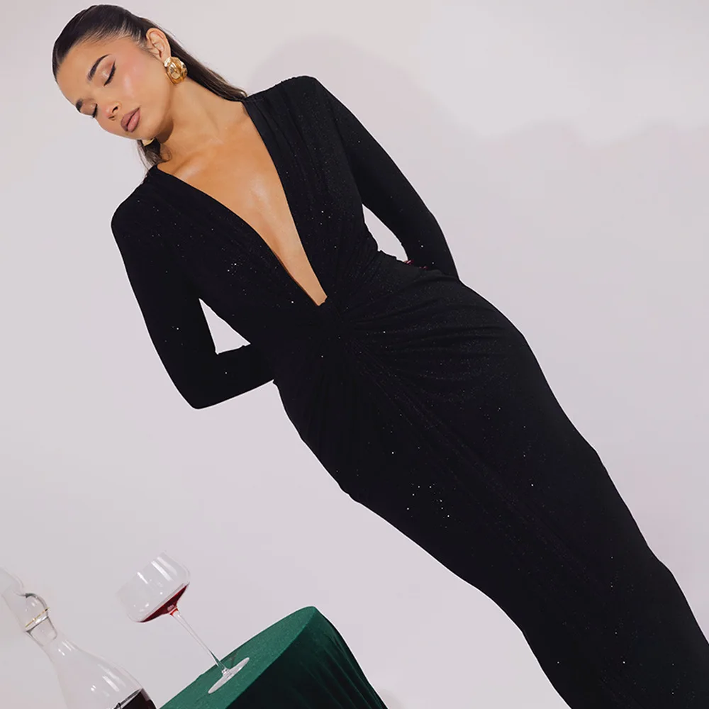 Robe longue pailletée à décolleté plongeant pour femme, élégante robe de soirée moulante à manches longues et fronces, style club, sexy