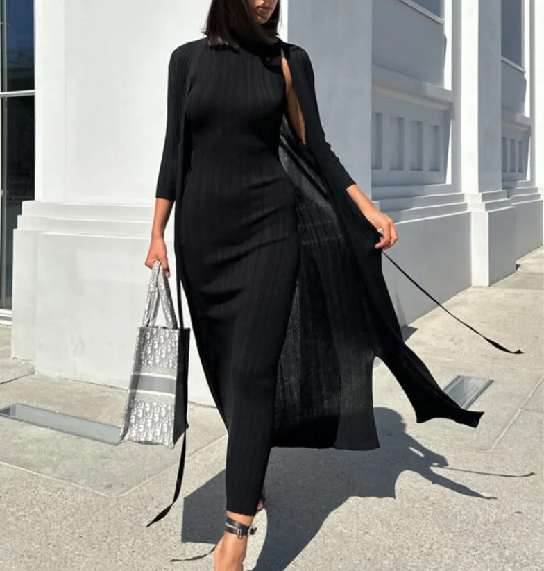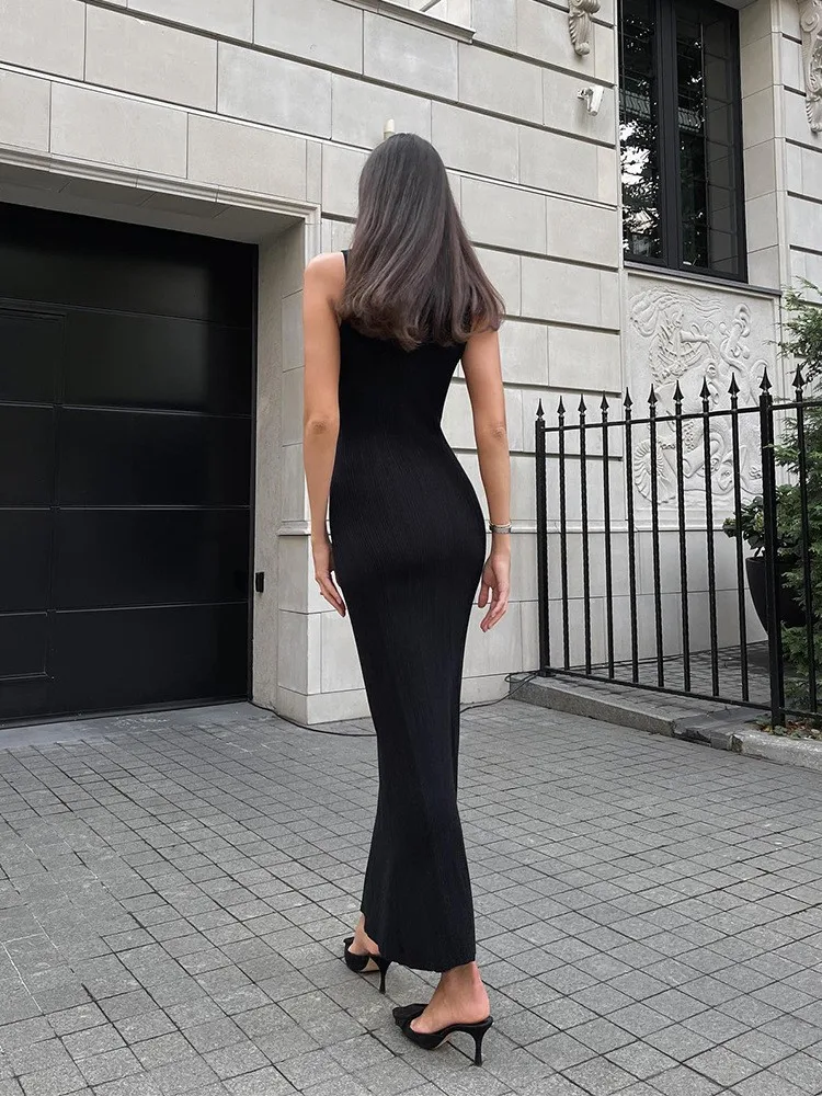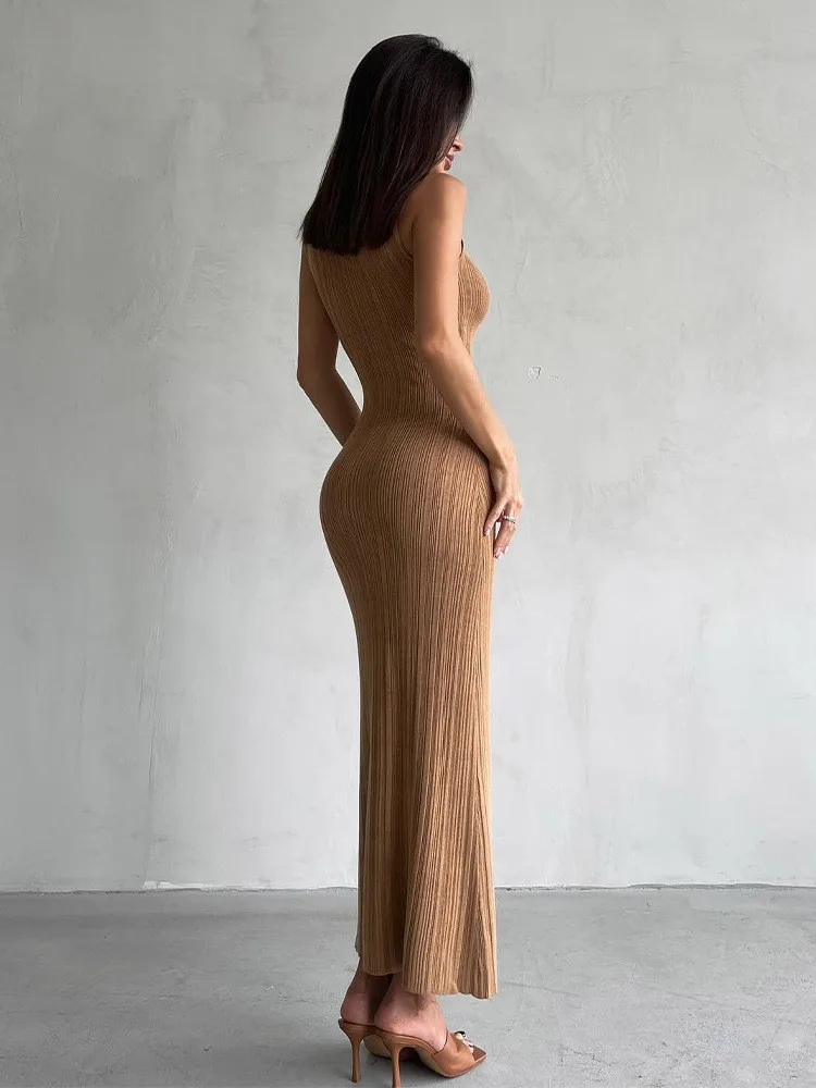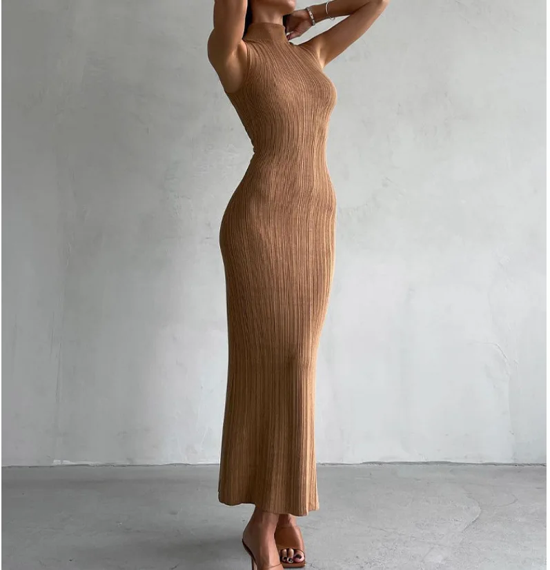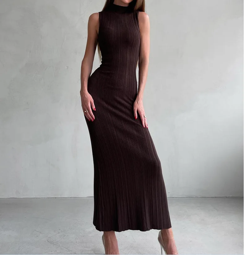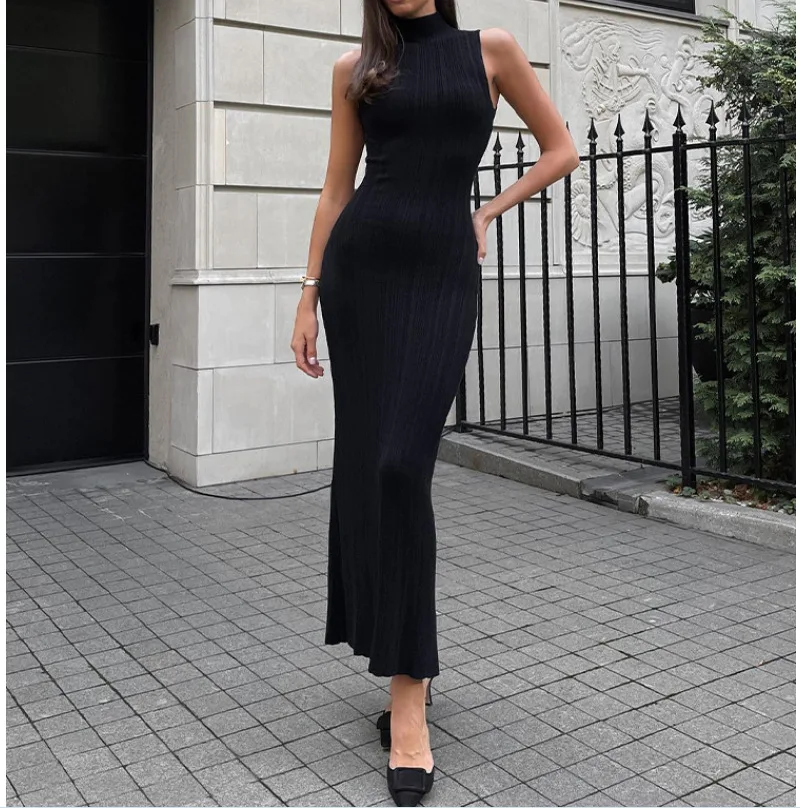 Robe longue moulante à rayures de couleur unie pour femme, sans manches, col roulé et demi-manches