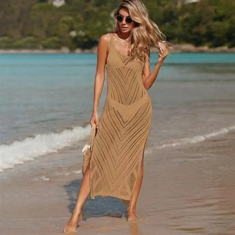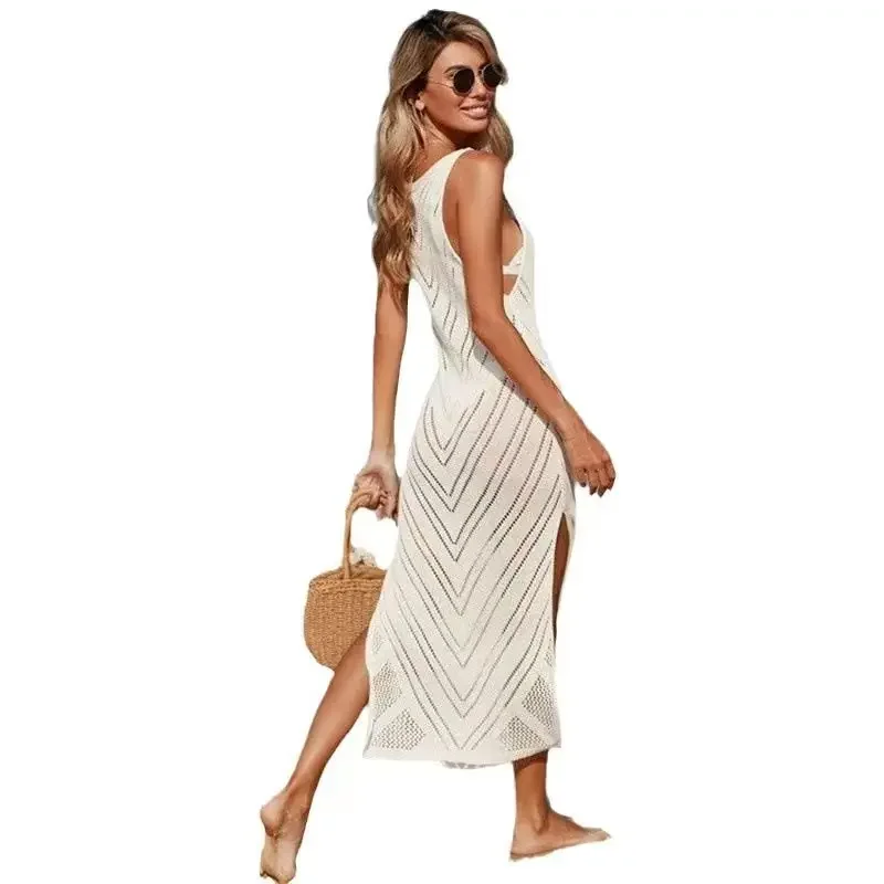 Robe longue d'été en tricot pour femme, tenue de plage sexy, col en U, ajourée, maille transparente, décontractée, slim